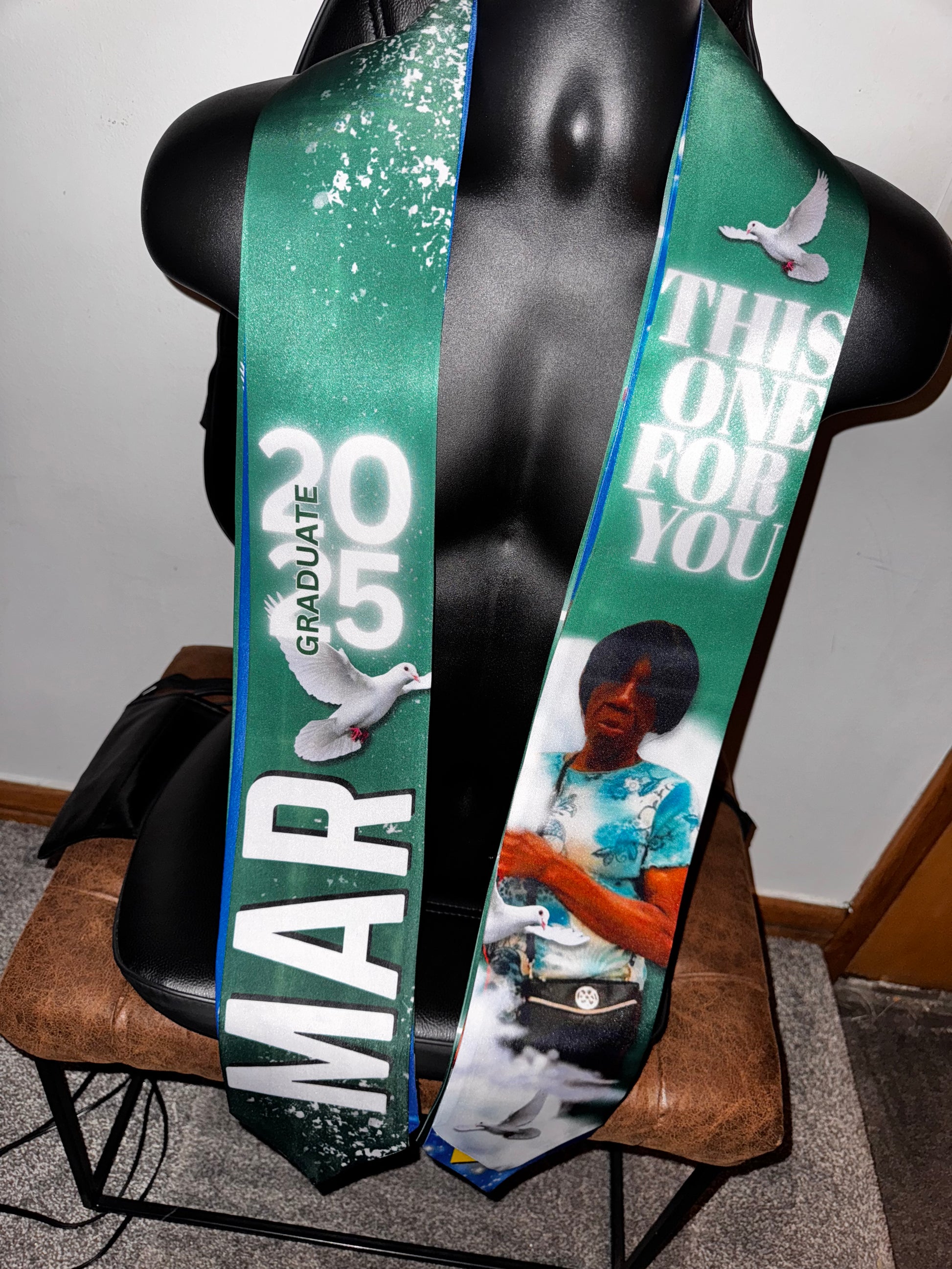 The 70-inch graduation stole is made of polyester and satin, and should only be hand washed. This adult stole features a V-shaped design that perfectly complements your graduation gown.